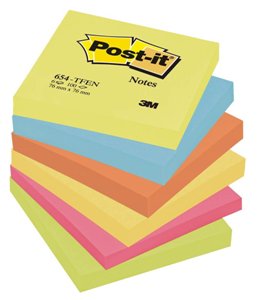 Post-it 654 en pack de 6 blocs de 100 hojas. Colores surtidos: amarillo ultra, azul ultra, naranja neón, amarillo ultra, fucsia y verde neón.